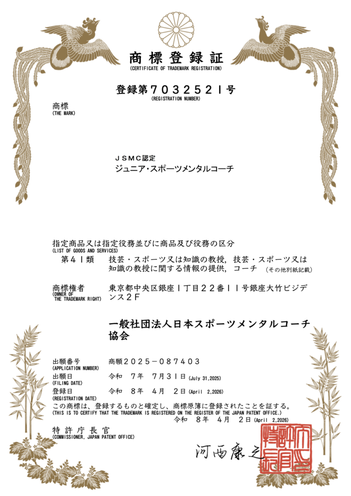 この度、一般社団法人日本スポーツメンタルコーチ協会(所在地:東京都中央区)は、当協会が育成・認定を行っている資格名称「ジュニア・スポーツメンタルコーチ」につきまして、特許庁より正式に商標として登録されましたことをお知らせいたします。